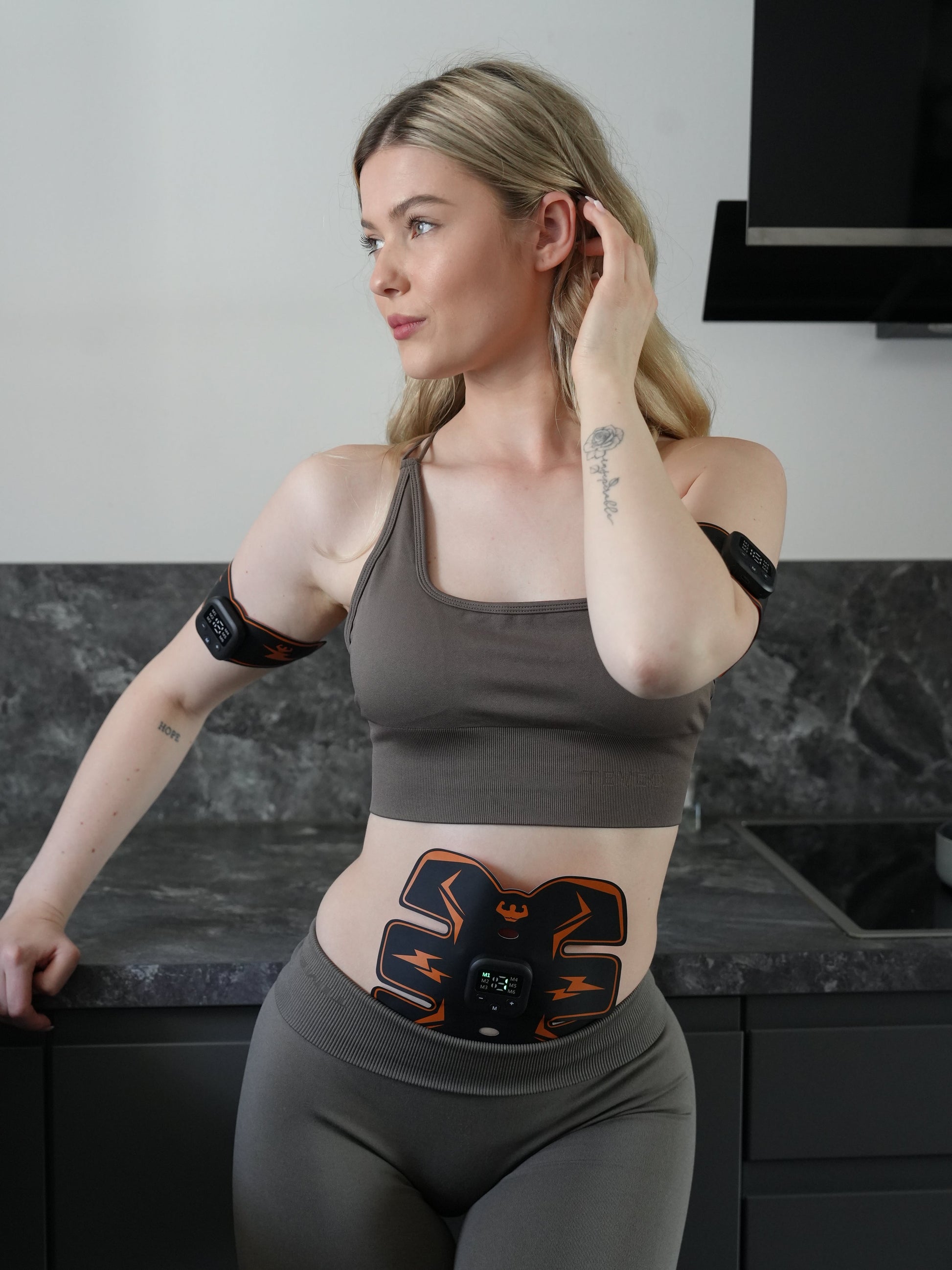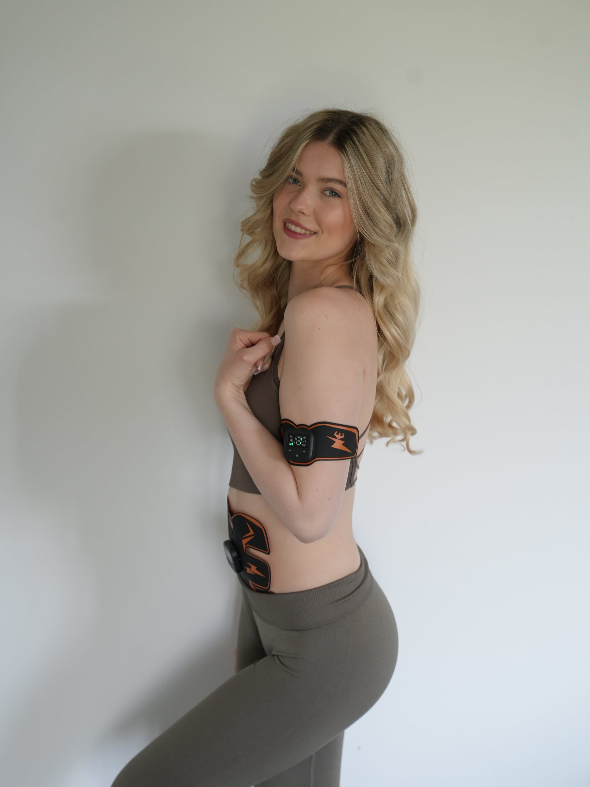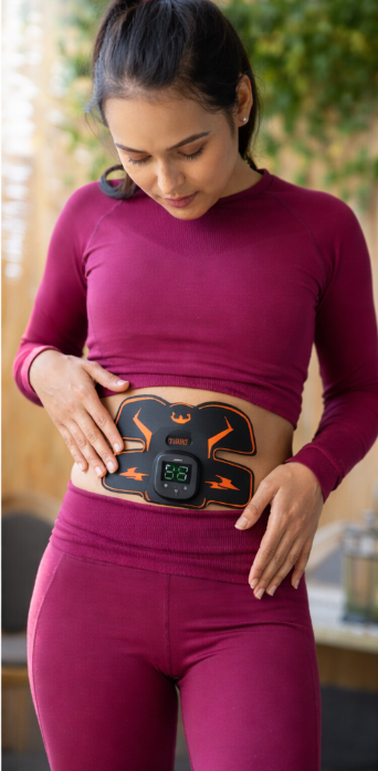 Muscle stimulation technology activates abdominal muscle fibers to help tone and define the core.